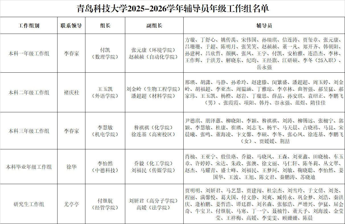 为加强辅导员队伍建设,提升学生工作质效,按照学校关于组建辅导员年级工作组开展工作的相关要求,结合辅导员带班情况,确立了各辅导员年级工作组名单。经研究决定,确定了4位处级干部联系指导各年级工作组,以及15名组长、副组长人选。各工作组根据年级工作侧重点,制定了2025年下半年重点工作任务计划,现一并予以公布。