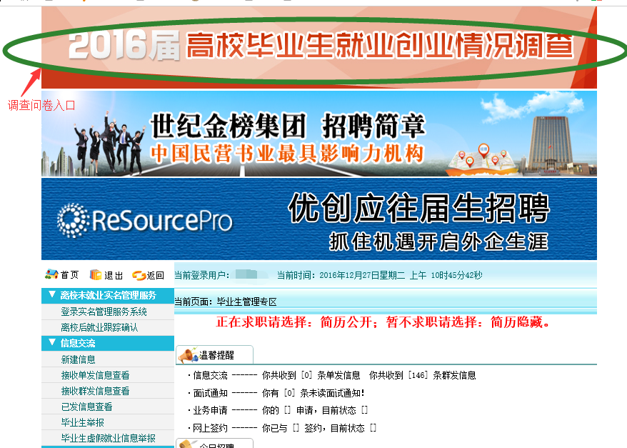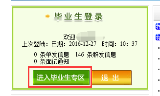 3、进入“进入毕业生专区”后,点击上方广告栏进入“2016届高校毕业生就业跟踪调查问卷”页面,填写完成后提交。