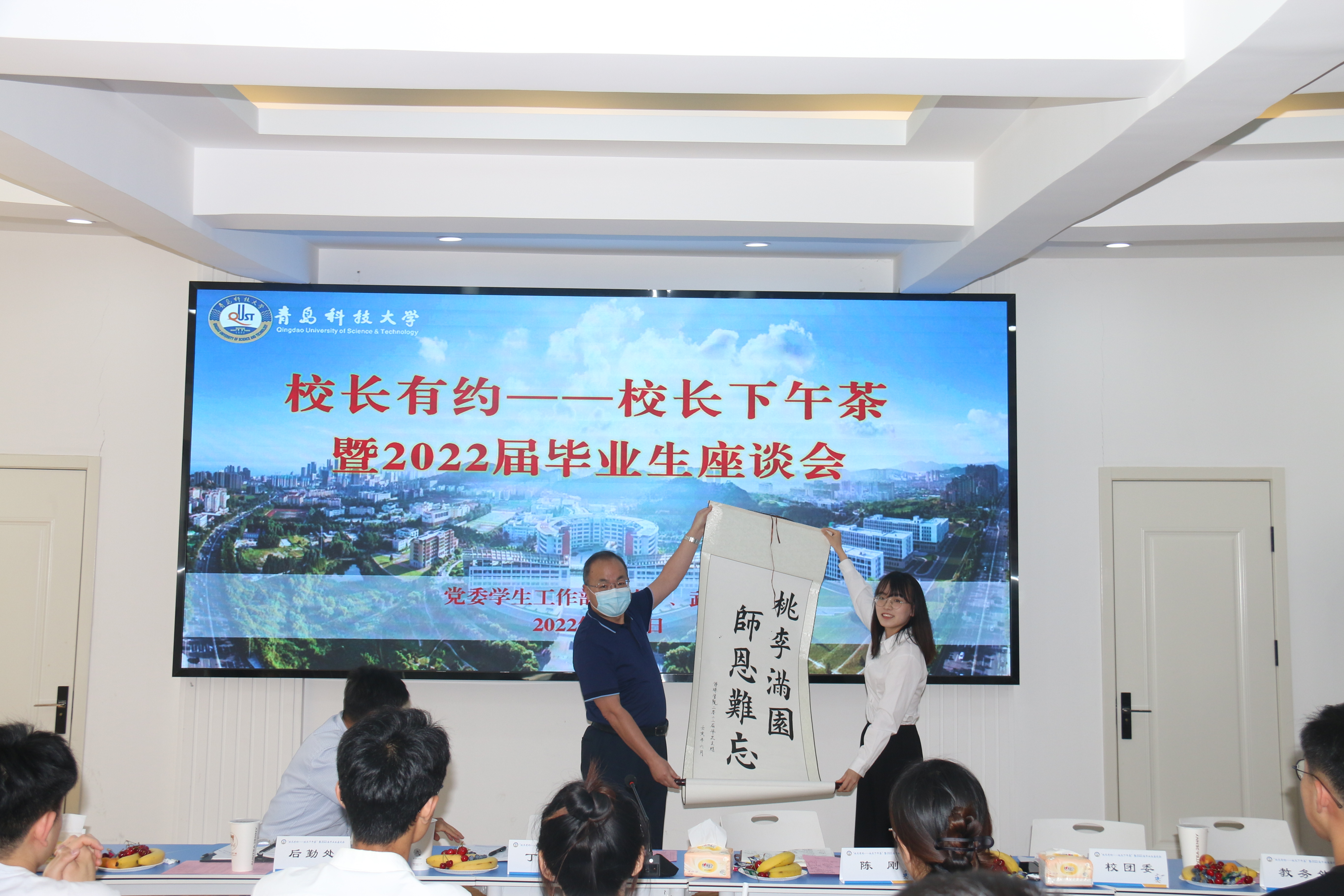 23位毕业生代表结合各自学习、生活体验,表达了对母校的感恩、眷恋之情,并就学校发展、教学科研、就业创业、校园文化和后勤保障等方面提出了意见建议。会后,毕业生代表们纷纷表示,参加座谈会暖心提气、催人奋进,这是一堂重要思政课,是最好的毕业礼物,未来将会传承科大家风,在新征程上奋力奔跑,争取跑出当代青年的最好成绩!传媒学院毕业生代表缪潇玄向学校赠送《桃李满园、师恩难忘》书法作品。