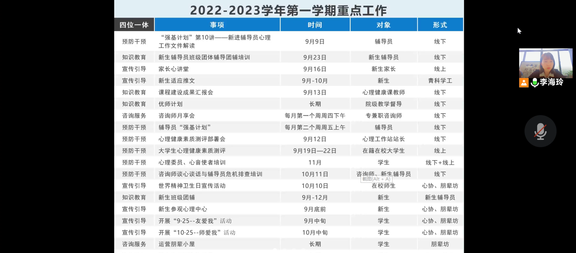 新学期伊始,为进一步做好校园心理安全稳定工作,扎实开展疫情防控态势下的心理健康服务与预防干预,9月12日上午,学校召开2022-2023学年第一学期心理健康工作部署线上会议。心理中心专职教师、各学院(校区)心理工作站站长参加了会议。