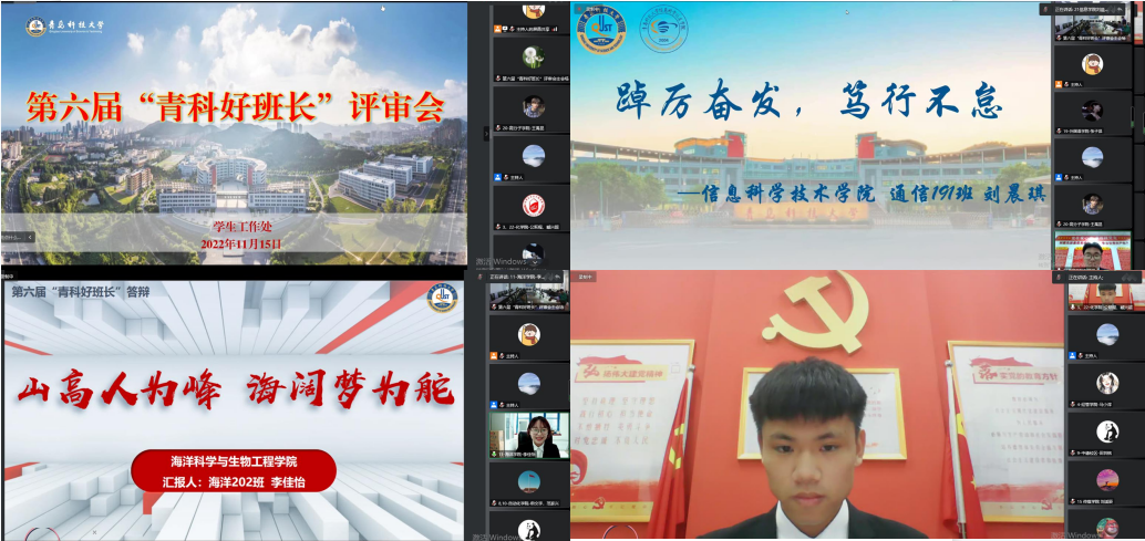 本次“青科好班长”现场评审受疫情影响,通过线上、线下相结合的方式成功举行,主会场设置在崂山校区综合服务楼3015会议室,各学院(校区)设置分会场。各学院(校区)学工办主任、班委代表参加了评审会。评审会上,22名候选人在风采展示环节介绍了自我发展、班级文化、活动组织、学风建设等内容,以PPT、视频等多种形式分享了自己作为班长的心路成长历程和带动组织班级同学共同参与活动等情况。在案例分析环节,各候选人针对班级管理服务过程中常见的学风建设、评奖评优、人际交往、心理健康、疫情防控等案例,现场进行了分析和解答,展现了良好的组织管理、应急应变以及分析与处理问题的能力。