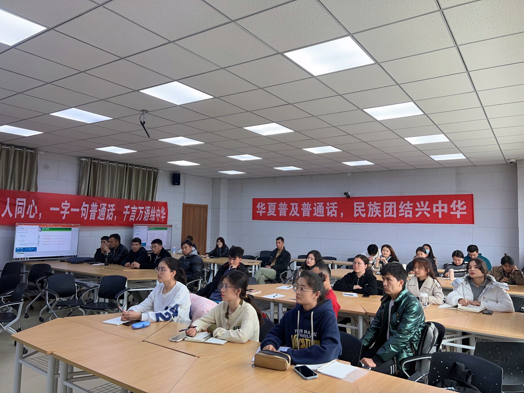 学校历来高度重视少数民族学生的国家通用语言文字培训工作,教务处语委办和少数民族学生工作办公室每年都积极筹备,协同联动,选拔包含国家级和省级普通话测试员的教学团队,精心制作教学课件,为培训工作的顺利开展打下了良好基础。此次培训班是少数民族学生利用晚自习时间全程培训为期10天,少数民族辅导员和相关学院辅导员全程跟训。