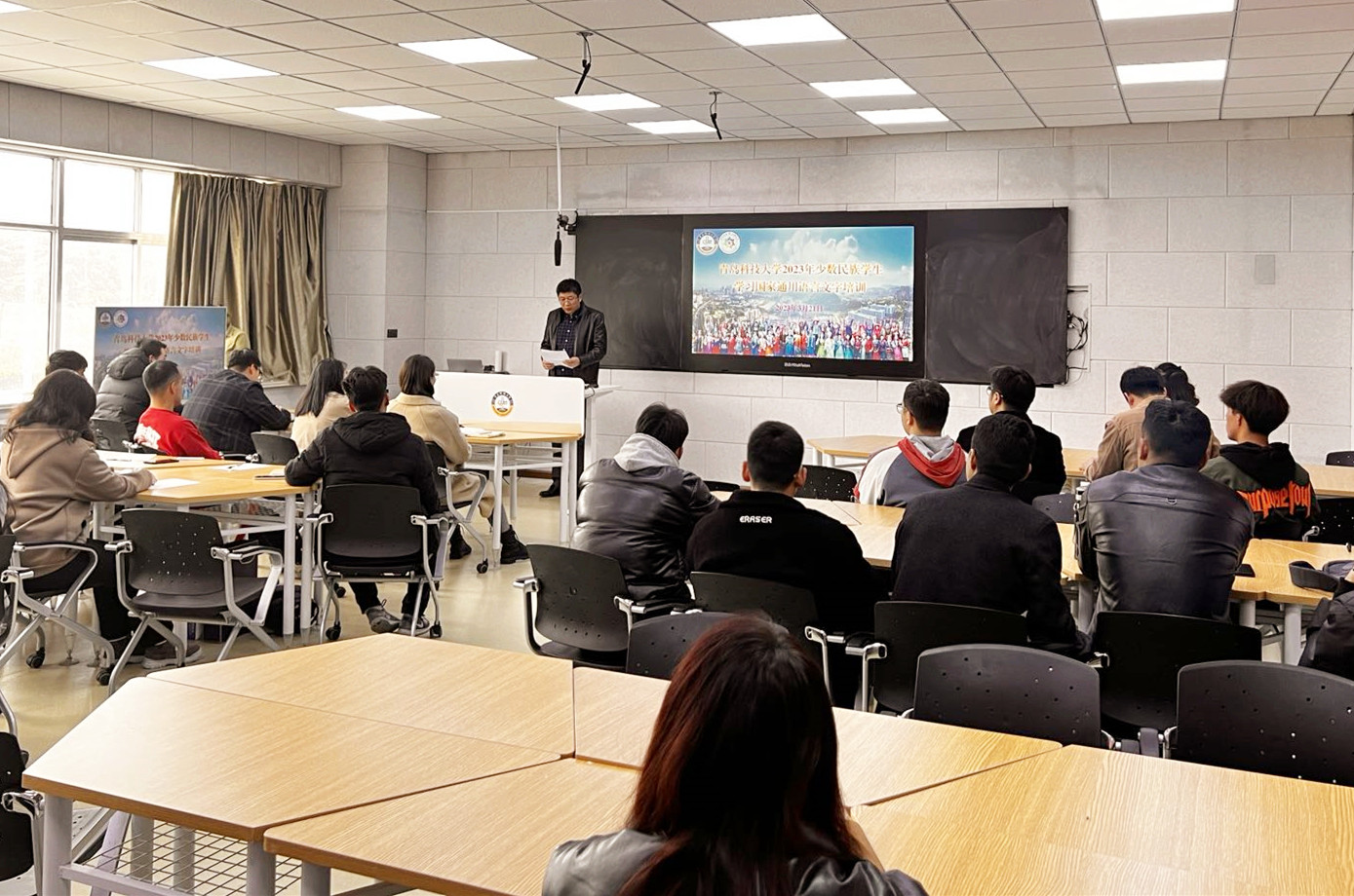 为进一步加大国家通用语言文字推广普及力度,有形有感有效铸牢中华民族共同体意识,促进各民族学生的交往交流交融,提升我校少数民族学生国家通用语言文字水平,3月21日,在崂山校区弘毅楼D203教室,校教务处语委办和少数民族学生工作办公室联合举办“太阳成集团tyc97282023年少数民族学生国家通用语言文字培训班”开班仪式。教务处、学生处等相关部门领导老师及40余名少数民族学生出席此次开班仪式,活动由少数民族辅导员热孜亚主持。