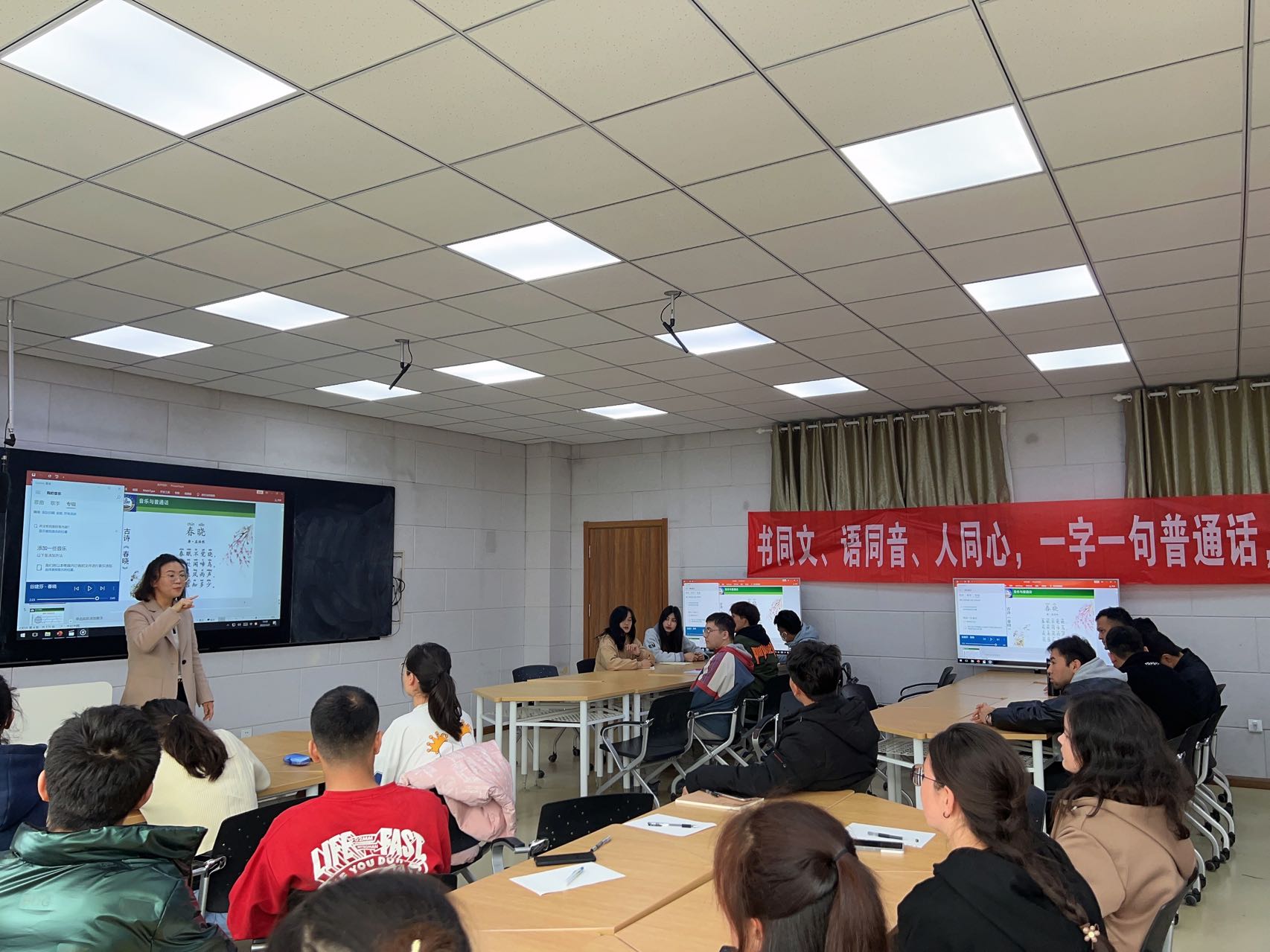 本期国家通用语言文字培训班的第一讲由省级普通话测试员、太阳成集团tyc9728艺术学院副教授王琳老师为同学们授课。王琳以国家普通话水平测试为落脚点,为同学们普及普通话测试内容、测试模块、考核等,通过将普通话与音乐发音相结合的方式,为学生们绘声绘色的讲解了声调的起伏变化特点,通过《我和我的祖国》、《阿拉木汗》等歌曲让学生们在音乐声中感受到语言声调的相通之处。在课上,同学们积极踊跃地回答问题并练习发音,老师耐心指导并指出问题,为同学们纠正发音,并对学生们提出要多听、多讲、多练,形成规范使用普通话的意识和习惯的要求。课后,参加培训的学生表示,王琳老师的讲解深入浅出、生动精彩,帮助自己掌握了相关技巧和方法,进一步坚定了自己学好普通话的信心。