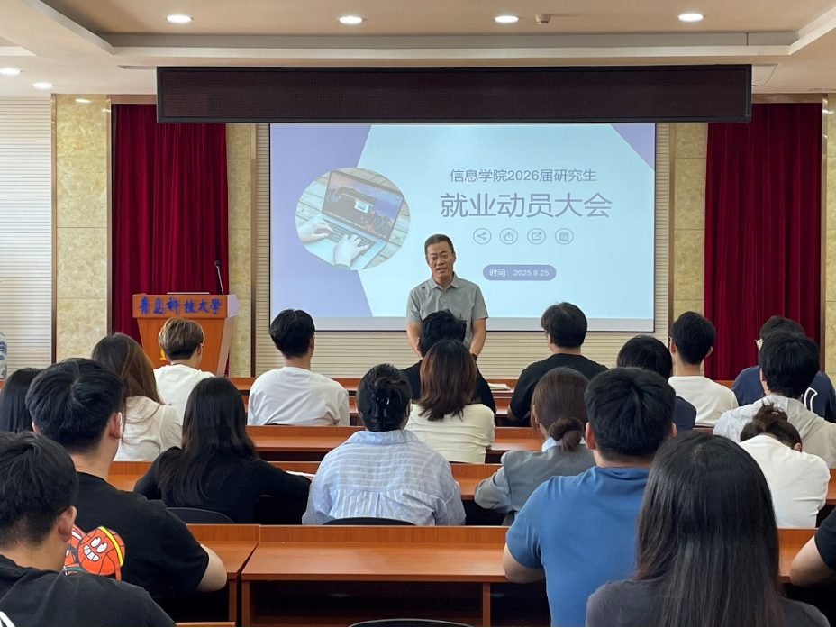 为积极应对当前就业形势,引导毕业生树立正确就业观,助力毕业生明晰职业规划、把握就业先机。信息学院于9月25日下午在402报告厅举行2026届研究生就业动员大会。学院党委副书记兼副院长严增兴作动员讲话,研究生辅导员屈会奇主持会议,学院2023级研究生同学参加。