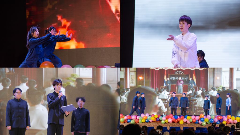 第一篇章 烽火淬砺启新程。百年薪火相传,青春担当生生不息。第一篇章以初心为引,在历史与当下的交融中,传递奋进力量。歌曲《少年中国说》歌声嘹亮,青年们用责任扛起集体荣光,用行动诠释青春力量。武术表演《剑心武韵》刚劲灵动,一招一式尽显中华武术千年风骨,彰显浓厚民族气魄。话剧《觉醒》重现热血岁月,学子们用青春之躯扛起家国重任,用赤诚之心守护山河无恙,在历史长河中刻下永不褪色的“五四”印记。