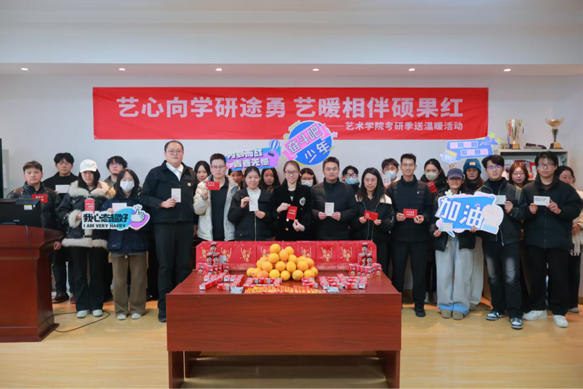 为缓解考研学子备考压力、鼓舞迎考士气,近日,艺术学院于213会议室举办“艺心向学研途勇 艺暖相伴硕果红”考研送温暖活动。学院党委副书记兼副院长丁一宁与全体辅导员老师参加活动,为即将踏上考研战场的学生送上真挚关怀与美好祝福。