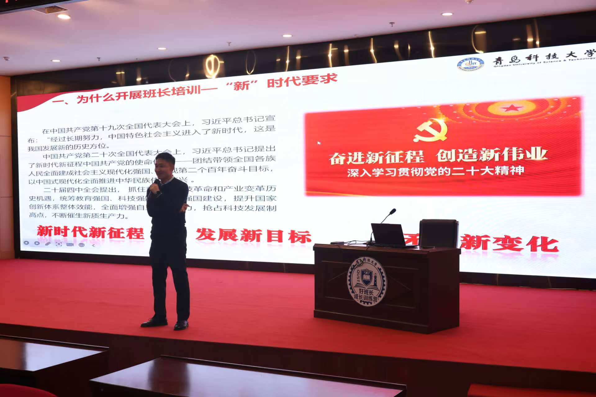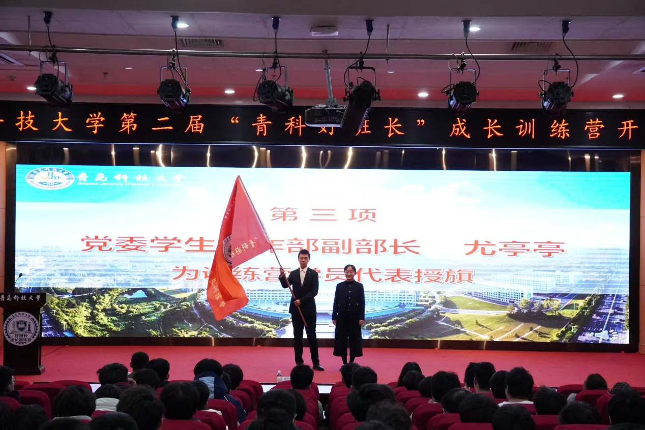 开班仪式上,尤亭亭为训练营学生代表刘名骐授旗,鲜艳的旗帜承载着学校的信任与期望,更凝聚着全体班长的责任与使命。贾明明详细介绍了第二届“青科好班长”成长训练营的培训方案,从课程设置、培训目标、实践安排等方面,为全体班长清晰勾勒出成长提升的路径。2025级班长代表赵冠铭登台作表态发言。
