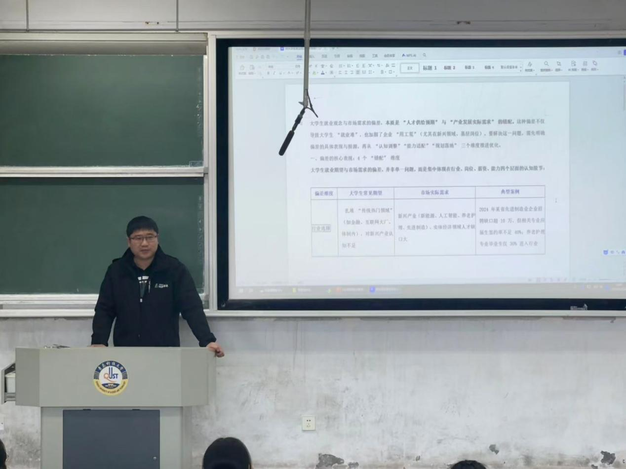 最后,马寒深入分析了当前的就业形势与特点,剖析了当前市场对外语人才的需求变化。他指出,外语专业学生应主动打破传统就业思维,积极拥抱新能源、人工智能、国际商务等新兴领域,构建“语言+专业技能”的复合优势,鼓励同学们积极利用寒假及后续时间参与高质量实习,提升就业竞争力。