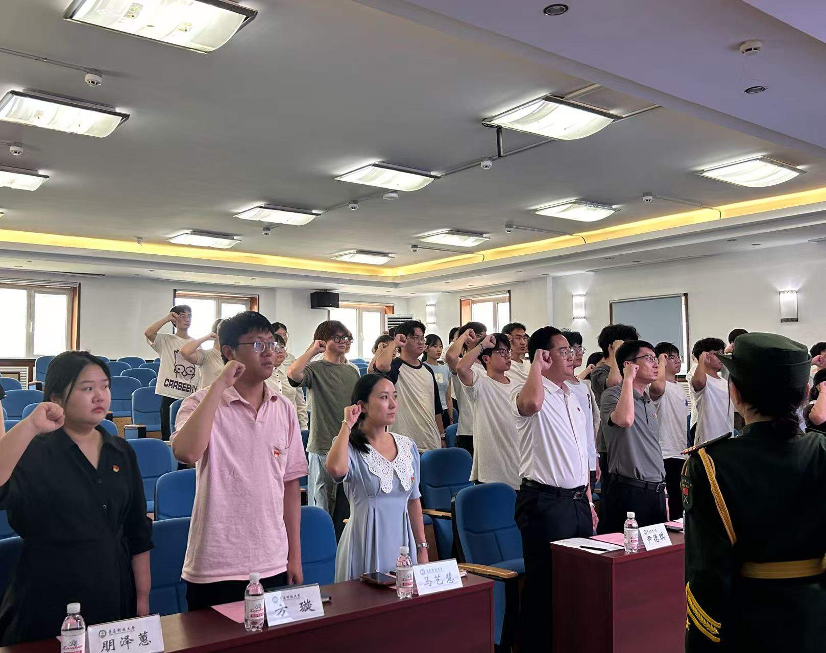贾明明为新发展党员代表发放了党员徽章、共产党员笔记本,学院团委副书记兼学生工作办公室副主任尹德琪老师宣读了《高分子科学与工程学院2025年上半年新发展党员名单》。最后,全体新发展党员高举右手紧握拳头,面对鲜艳的党旗庄严宣誓。
