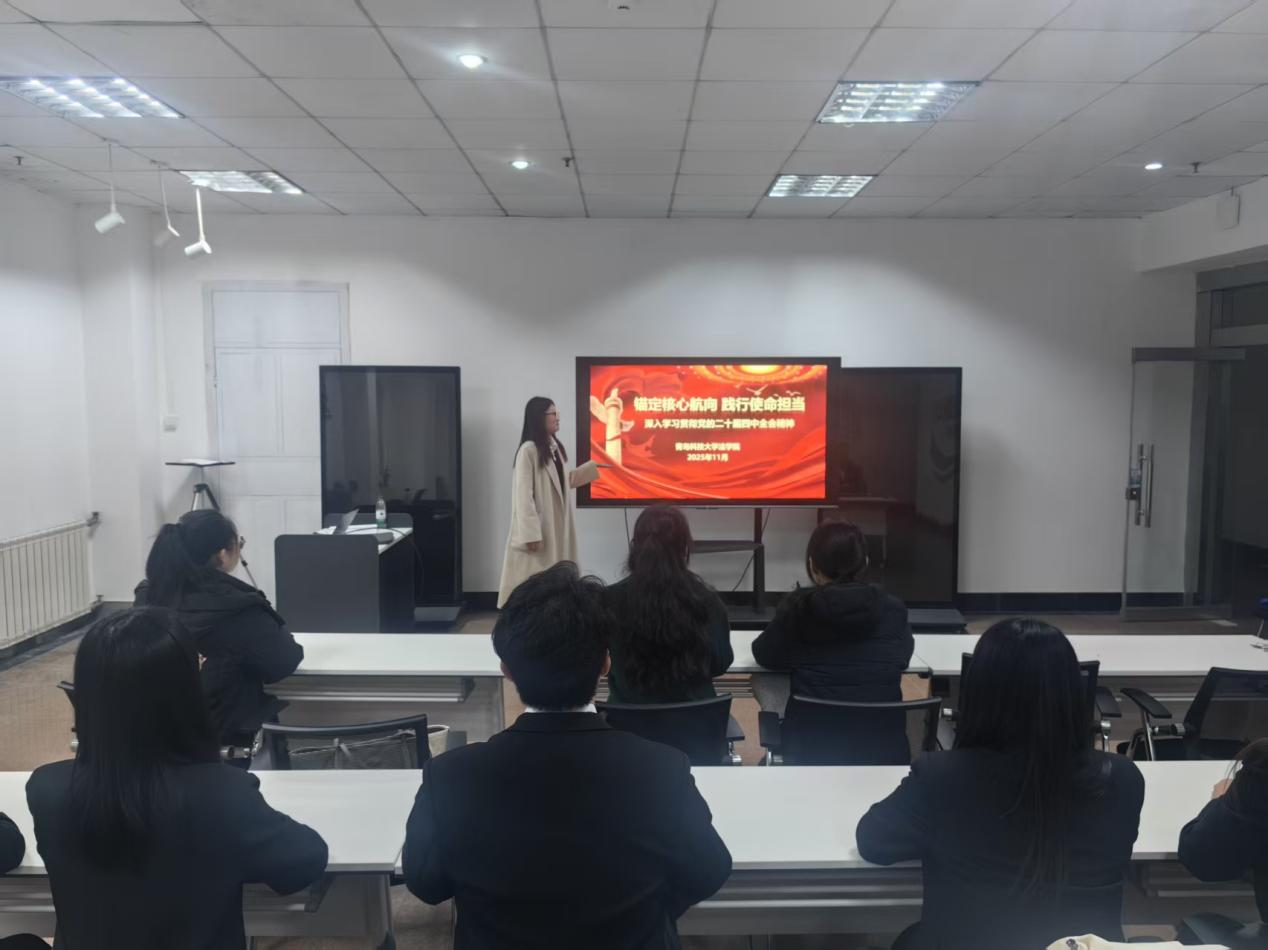 聚焦全会公报,深刻把握时代方位。与会成员集体观看《中国共产党第二十届中央委员会第四次全体会议公报》视频,系统了解全会召开的时代背景与重大意义。研读“十五五”建议,锚定青年奋斗坐标。研究生会李佳璐同学围绕《中共中央关于制定国民经济和社会发展第十五个五年规划的建议》以及《公报》等内容展开领学,学习过程中,成员们积极讨论,进一步深化了对“理论指导实践”的认识。《公报》提炼要点,与会成员感悟。与会成员分别聚焦理论学习、创新创业、社会实践与专业特色等内容,结合自身工作实际,分享了学习体会。