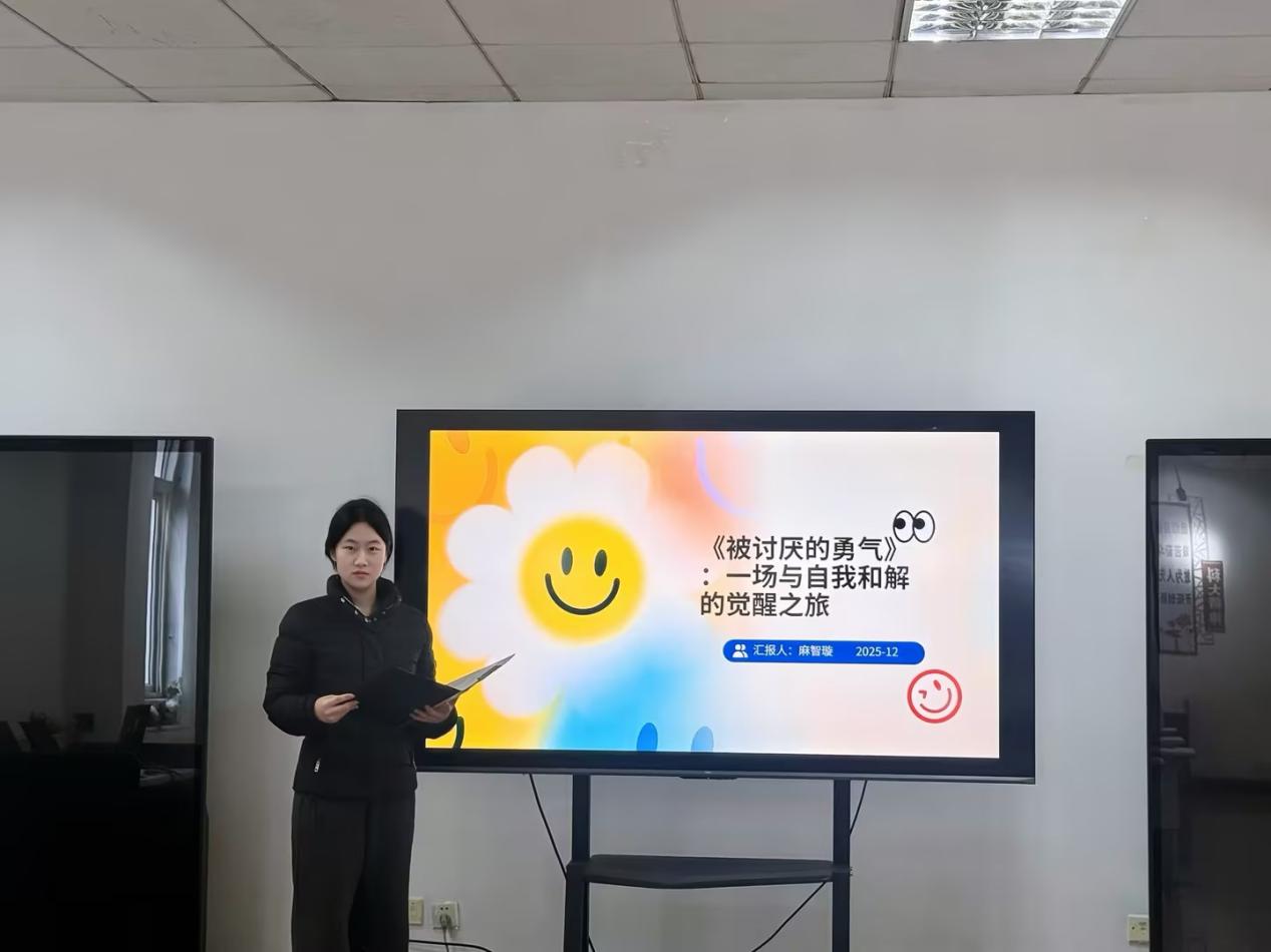 活动以原创校园情景短视频启幕,精准捕捉“为合群放弃心仪选修课”“因他人评价硬撑无效社交”等大学生高频心理困境,引发全场强烈共鸣。分享人麻智璇系统阐释书籍特色——采用青年与哲人对话体,将阿德勒心理学“课题分离”“共同体感觉”“自我接纳”三大核心理论生活化呈现,强调“被讨厌的勇气”本质是挣脱他人评价桎梏、实现自我接纳的成长智慧。