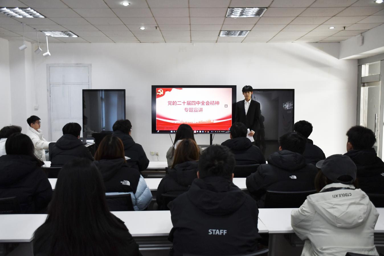 宣讲会上,王峥从党的二十届四中全会召开的时代背景切入,系统阐释了会议取得的重大成就、作出的战略部署以及提出的目标任务。他结合详实的数据与鲜活的事例,全面回顾了“十四五”时期我国经济社会发展所取得的显著成就。同时,针对“十五五”时期经济社会发展的指导思想、重大原则和主要目标进行了深入解读,助力同学们精准把握国家未来发展的宏伟蓝图与战略方向。王峥还号召同学们将学习贯彻全会精神与自身成长成才紧密结合,团结一心、奋勇前行,积极推动全会精神在校园内落地生根、开花结果。