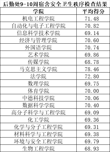 根据学校工作安排,后勤管理处组织公寓管理人员开展崂山、四方校区9-10周宿舍安全卫生秩序检查。本次共检查宿舍5026间,经统计,合格及以上宿舍4827间,不合格宿舍199间。各学院平均得分如下所示。