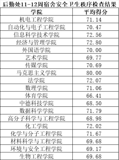 根据学校工作安排,后勤管理处组织公寓管理人员开展崂山、四方校区11-12周宿舍安全卫生秩序检查。本次共检查宿舍4841间,经统计,合格及以上宿舍4668间,不合格宿舍173间。各学院平均得分如下所示。