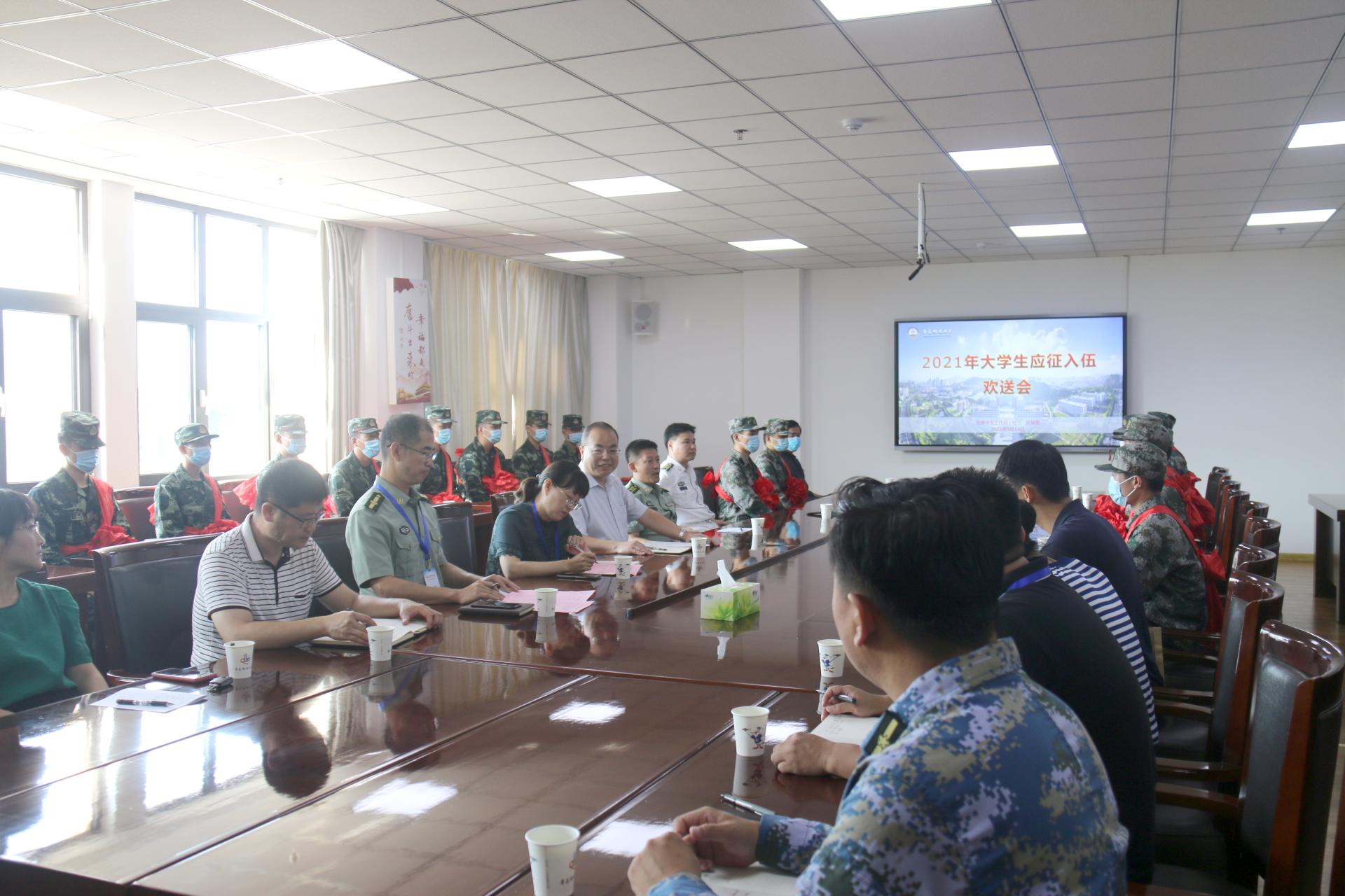 9月14日上午,9月14日上午,学校2021年夏季新兵入伍欢送会在崂山校区综合楼3015会议室举行。党委常委、副校长丁林,青岛警备区党委常委、动员处处长陈兵,市北区党委常委、武装部部长王维,学校学工部副部长王丽,部分学院分管书记、辅导员、入伍大学生代表等参加会议。会议由武装部副部长曹永俊主持。