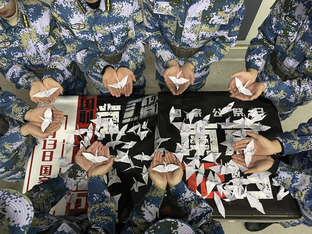 晚上7点在二教101教室,组织各学院学生干部代表奏唱国歌,默哀致敬。常立科同学进行纪念南京大屠杀死难者国家公祭日主题演讲,呼吁新时代青年大学生们铭记历史、砥砺前行。随后大家一起亲手折成一只只千纸鹤,寄托对遇难同胞的哀思。通过悼念仪式,成员们纷纷感言,我们要以史为鉴、开创未来,对那段惨痛历史始终保持唤醒状态,让中华儿女牢记侵略战争带来的深重灾难,表明中国人民反对侵略、捍卫尊严的坚定立场,一起维护世界和平及正义良知,促进人类共同发展和时代进步。