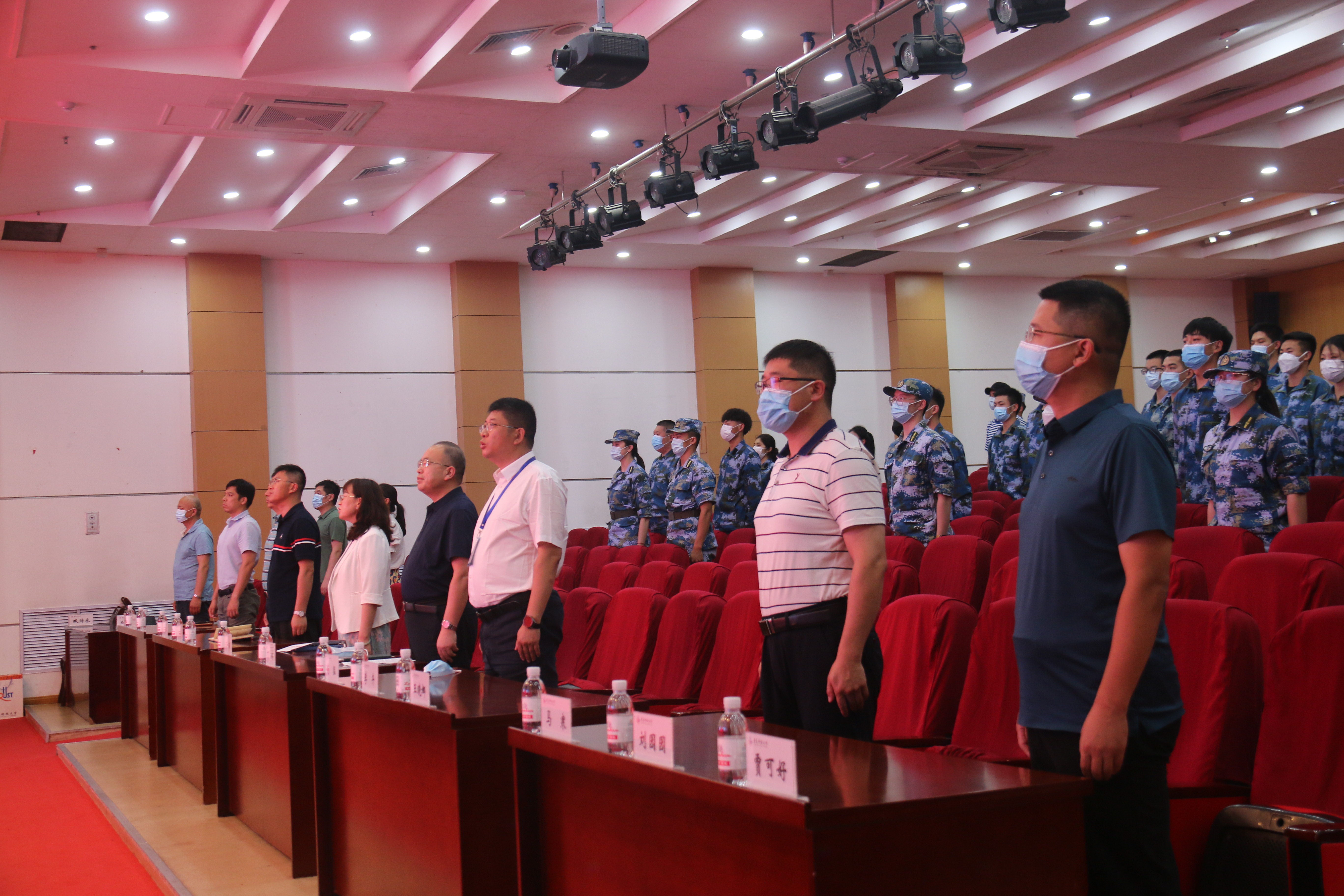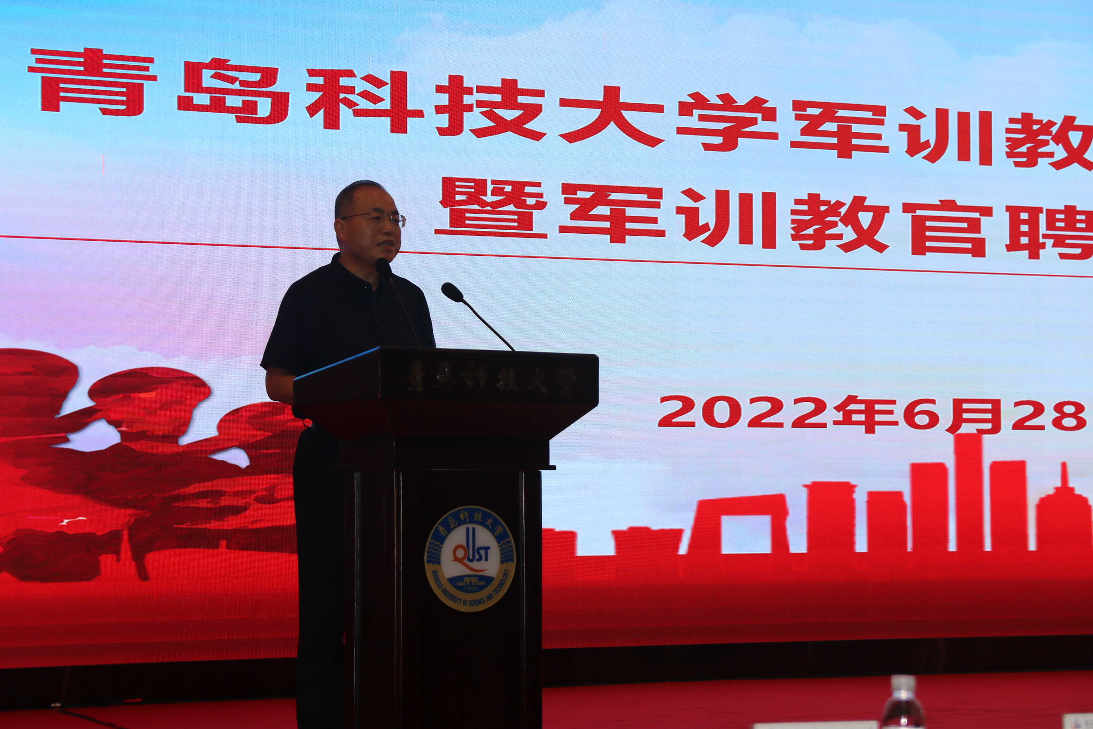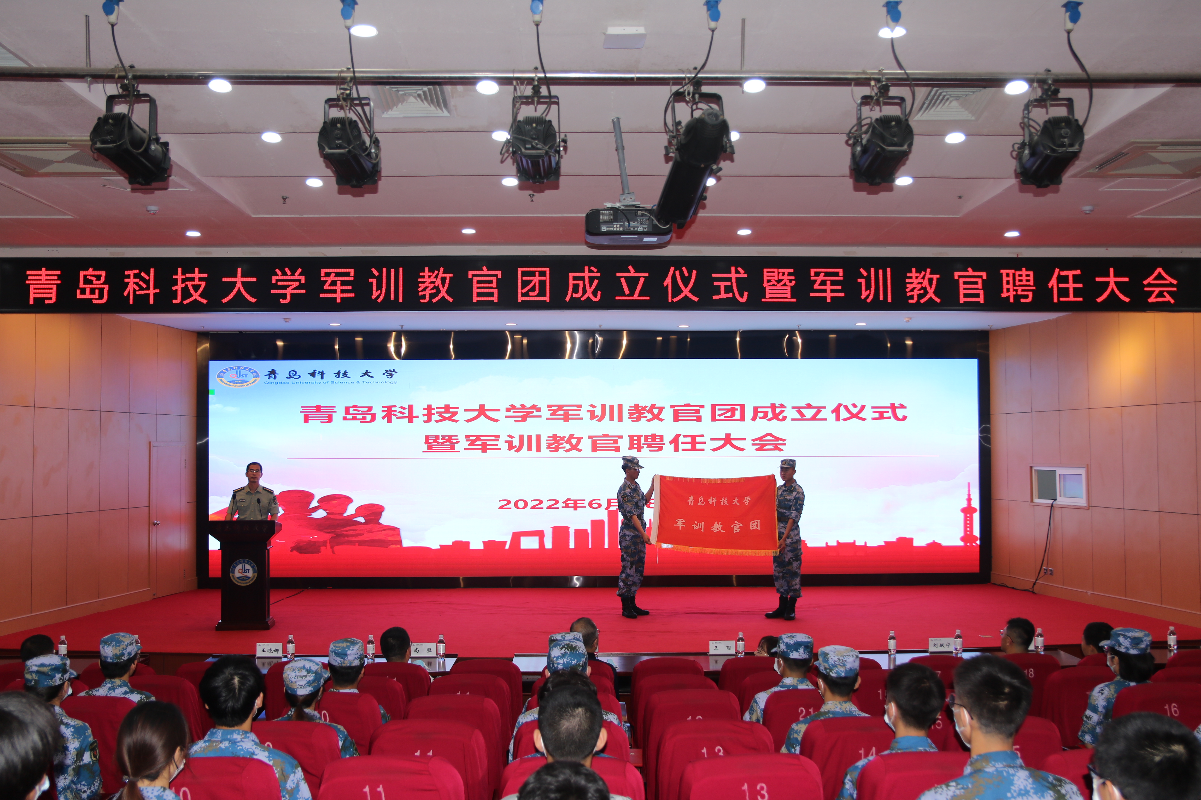 6月28日下午,太阳成集团tyc97282022级学生军训团成立暨军训教官聘任大会在崂山校区第三报告厅举行。党委常委、副校长丁林在大会上进行了讲话并向军训团授团旗。