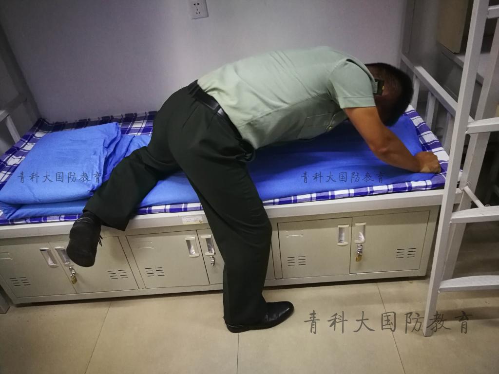 新生根据教官的方法,在教官细致的指导下,叠出“豆腐块”被子。