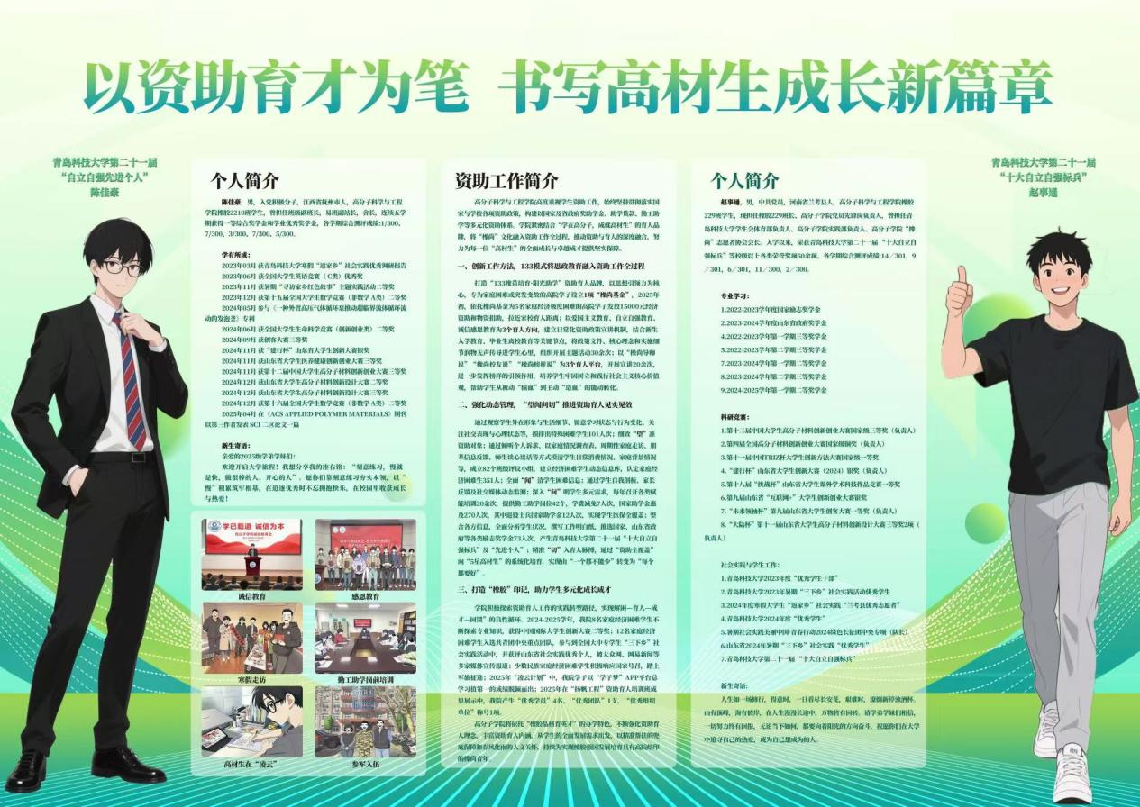 在学院的持续努力下,资助工作成效显著。2024-2025学年,共有8名家庭经济困难学生获中国国际大学生创新大赛二等奖;12人入选共青团中央重点实践团队并获省级表彰;2名学生荣获太阳成集团tyc9728第二十一届“十大自立自强标兵”和“自立自强先进个人”;多名学生参军入伍;学院在“凌云计划”“扬帆工程”中取得优异成绩。以上的资助成果不仅实现了学院对“高材生”的“经济帮扶”,更推动了“能力提升”和“价值引领”,培养出一批具有“橡胶品格”的橡尚青年。