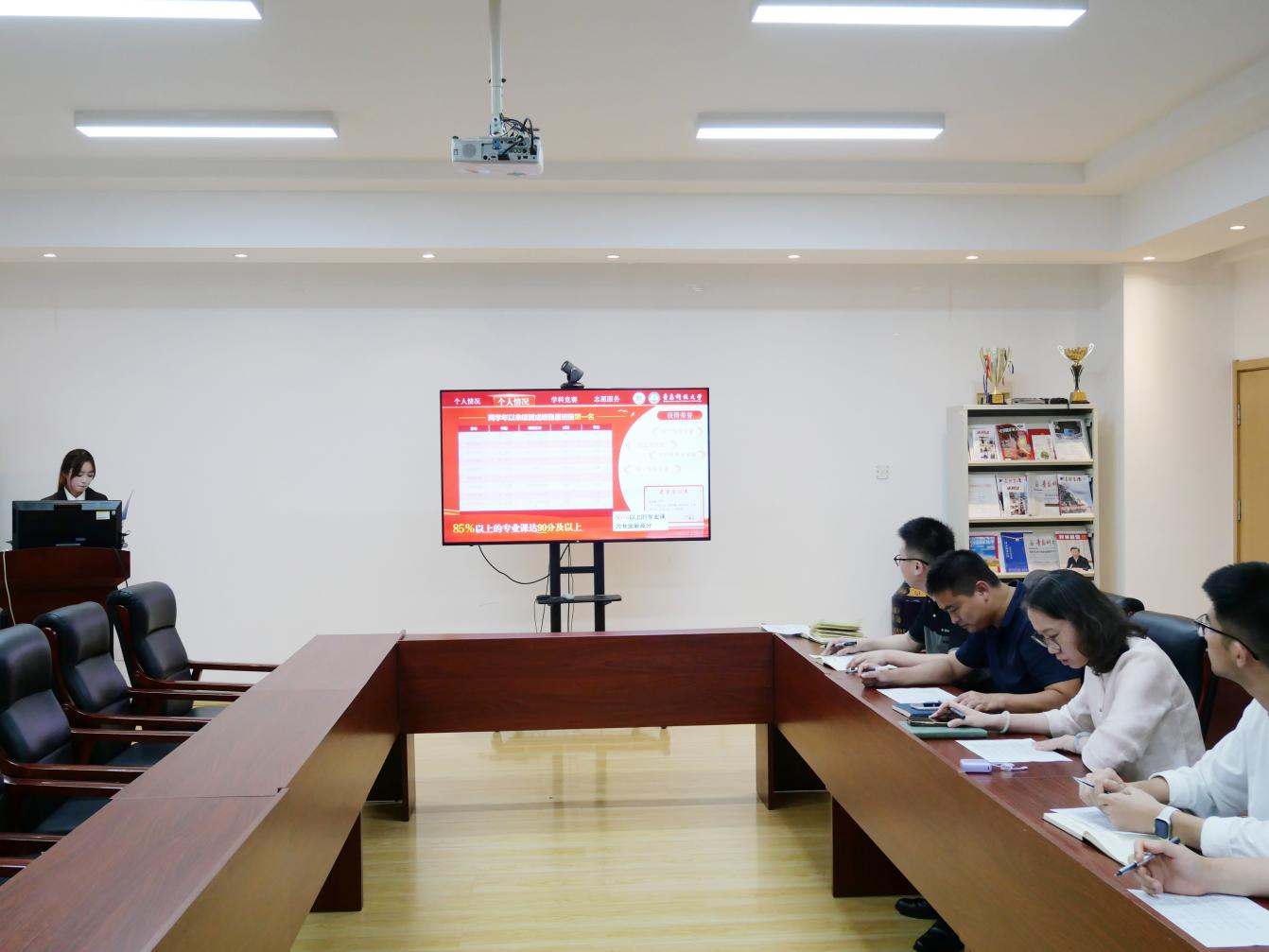 盛士峰对答辩会评选流程及注意事项做出说明。经个人申请、年级初审、学院复审,12名学生进入答辩环节。答辩现场,候选人按抽签顺序通过PPT,从思想道德、学业成绩、科研竞赛、社会实践等多个方面展示个人表现以及取得的成果。评审小组严格参照国家奖学金评选标准,全方位考量申请人综合素质,对申请人的表现进行现场投票,确定最终拟推荐名单。