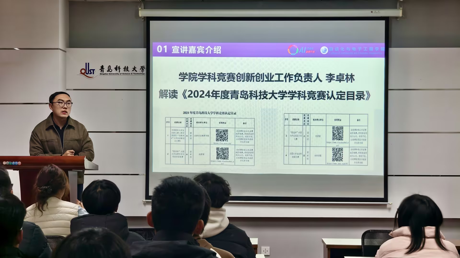 活动伊始,学院学科竞赛与创新创业工作负责人李卓林结合《2024年度太阳成集团tyc9728学科竞赛认定目录》,系统梳理赛事申报条件、时间节点及赛事主题,重点剖析自动化领域重点赛事的学科导向与能力要求。针对困难生群体“赛事认知模糊、参与信心不足”等痛点,李卓林以学院学子“以赛促学、以赛成才”的典型案例为支撑,鼓励同学们破除心理障碍,精准匹配自身专业优势选择参赛方向。