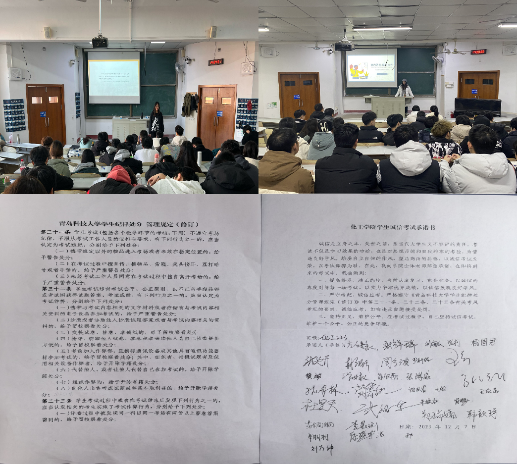 化工学院将诚信教育与学风考风教育、防诈骗教育相结合,通过召开主题班会的形式进行宣传教育,讲解诚信的重要性以及违反诚信的后果,并结合具体案例,提醒学院受助学生合理利用奖助学金,树立正确、科学的消费观,阐述了如何识别和防范电信网络诈骗。其次,引导同学们加强对诚信考试重要性的认识、树立诚实守信的行为习惯,鼓励同学们在各项考试中努力复习、认真备考,尽全力考出自己的真实水平,组织同学们签写《期末诚信考试承诺书》和《四六级考试诚信承诺书》,进一步明确考试纪律,增强学生遵规守纪意识。