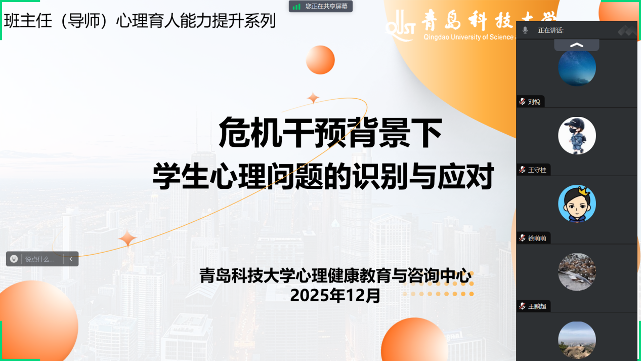 培训围绕“危机干预背景下:学生心理问题的识别与应对”这一主题,紧扣高校心理健康教育工作的关键难点。主讲人结合真实案例,系统剖析了大学生常见心理问题的成因与表现形式,重点讲解了从学习状态、情绪变化、行为表现和生活作息四个维度识别心理异常信号的实用方法。