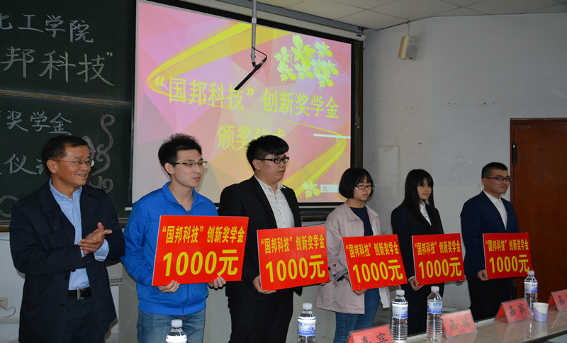 4月25日下午,化工学院举行“国邦科技”创新奖学金发放仪式,学院党总支书记钱翌、副书记孙明媚,教师代表冯柏成,分团委全体辅导员,获奖学生以及各年级学生代表参加发放仪式。