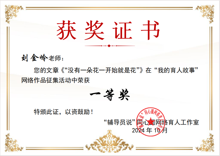 生物工程学院辅导员刘金岭撰写的“没有一朵花从一开始就是花”的育人故事荣获一等奖。