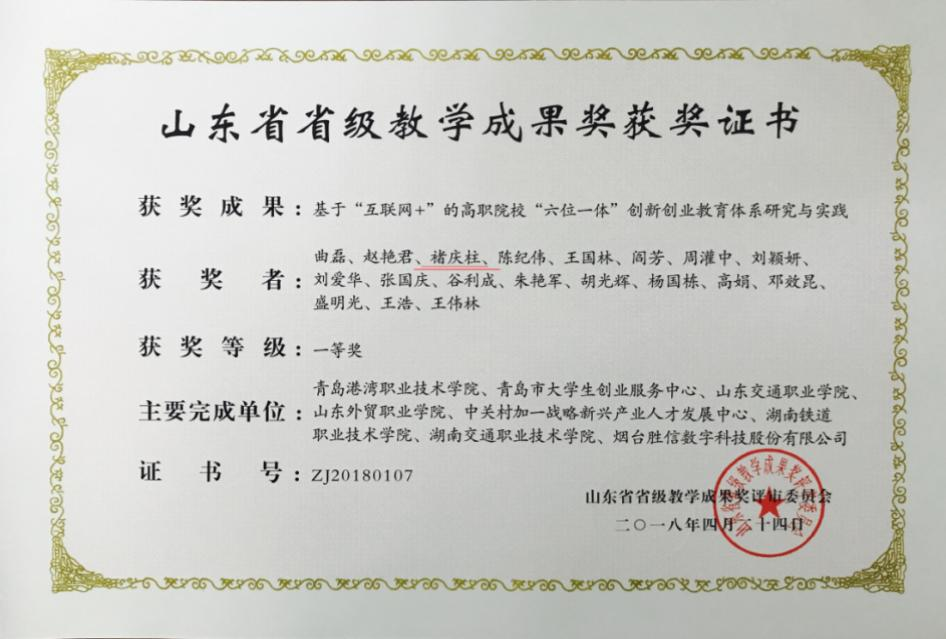 山东省省级教学成果奖一等奖:基于“互联网+”的高职院校“六位一体”创新创业教育体系研究与实践