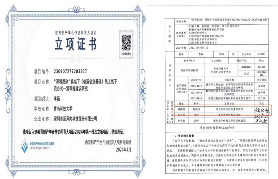 教育部产学合作协同育人项目:“课程思政”视域下《创新创业基础》线上线下混合式一流课程建设研究